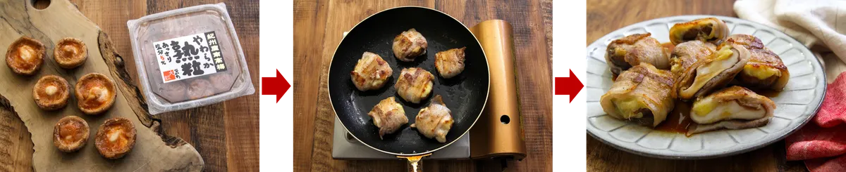 2.椎茸に梅干しを塗り、ピザ用チーズ40gを6等分に分けて乗せ、豚バラで巻く。