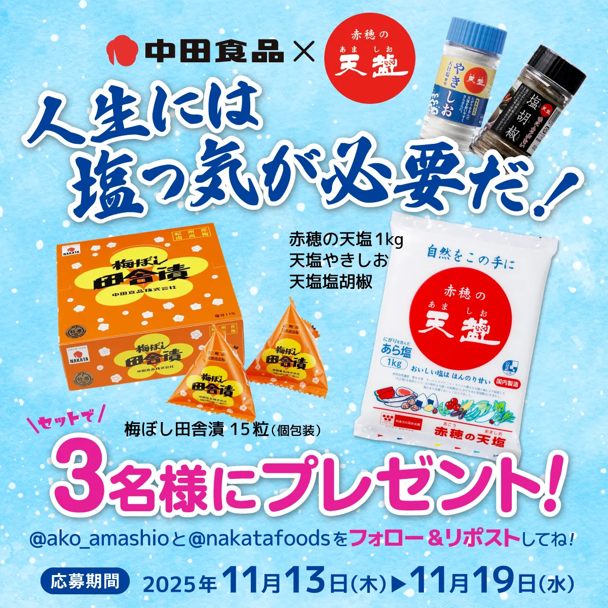 トップ > うめニュース > #キャンペーン > 【Xコラボキャンペーン】赤穂の天塩×中田食品 うめニティ運営スタッフ 2025/11/13 10:15 【Xコラボキャンペーン】赤穂の天塩×中田食品 梅干し作りに欠かせないものといえば・・・そう、『塩』ですよね!そこで今回は『塩」のプロ、赤穂の天塩さんと本日よりXコラボキャンペーンのスタートです🎉🎊そんな今回のテーマは「人生には塩っ気が必要だ!」人生は甘いだけじゃ物足りない。時にはピリッとした刺激や、心に残る味わいがあってこそ、豊かで深みのあるものになる。中田食品の梅干しと赤穂の天塩が届ける“塩っ気”は、そんな人生のスパイス。日々の暮らしに、ちょっとしたアクセントを。皆さまのご応募お待ちしております📣 いいね 共有する 共有する X facebook LINE リンクをコピー コメントする 3 件の返信 (新着順) ミュートしたユーザーの投稿です。 投稿を表示 とも 2025/11/23 06:01 参加してみます! いいね 返信する ミュートしたユーザーの投稿です。 投稿を表示 iaru 2025/11/14 09:49 塩のプロと梅のプロ♪ いいね 返信する ミュートしたユーザーの投稿です。 投稿を表示 さおりん 2025/11/13 18:00 応募させていただいております!!!🫡🫡🫡✨✨ いいね 返信する
