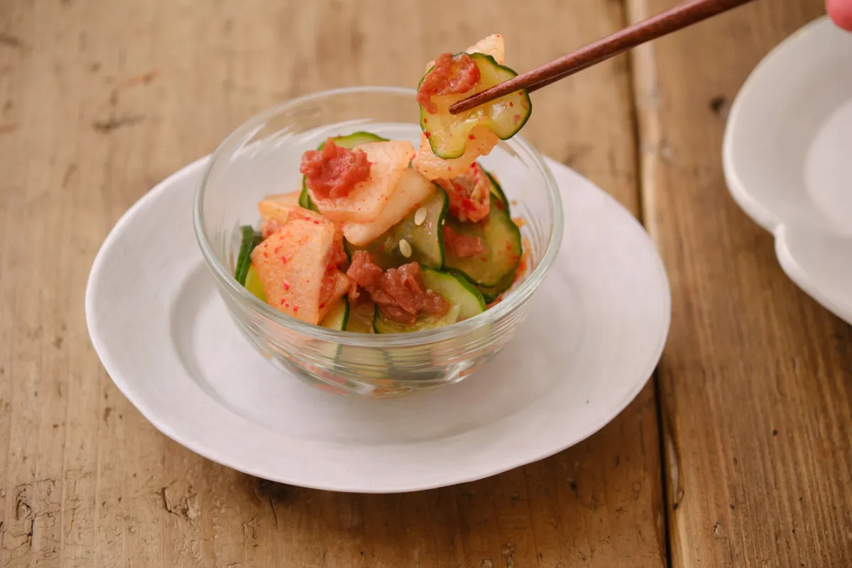 本日ご紹介するレシピは...「きゅうりと梨の梅キムチ和え」✨