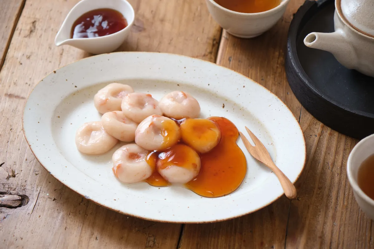 白玉団子は平らにして真ん中をへこませることで、火が通りやすくなり、タレがからみやすくなります✨